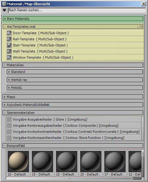 Der größte Teil der Material-/Map-Übersicht besteht schlicht aus einer Liste von Materialien, Maps und Controllern, die in Bibliotheken und Gruppen unterteilt sind. Jede Bibliothek und Gruppe hat eine Titelleiste mit einem Öffnen/Schließen-Symbol (+/-), das Sie zum Erweitern und Schließen der Liste verwenden können. Gruppen können über Untergruppen mit eigenen Titelleisten verfügen, und einige Untergruppen können weitere Untergruppen enthalten.