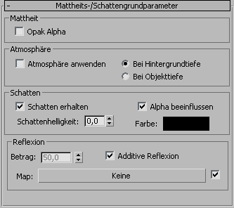 - Deaktivieren Sie im Rollout "Mattheits-/Schattengrundparameter" die Option "Opak Alpha", und aktivieren Sie die Optionen "Schatten erhalten" und "Alpha beeinflussen".