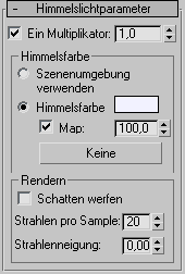 [Map-Steuerelemente]Über diese Steuerelemente können Sie mithilfe eines Maps die Himmelslichtfarbe bestimmen. Über diese Schaltfläche wird ein Map zugewiesen, und über die Ein/Aus-Schaltfläche wird das Map aktiviert. Das Zahlenauswahlfeld legt fest, welcher Prozentsatz des Maps verwendet werden soll. (Wenn der Wert unter 100 % liegt werden die Map-Farben mit der Himmelsfarbe gemischt.)