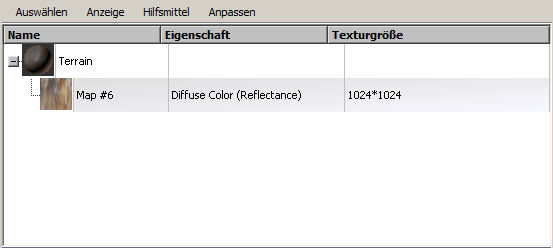 Wie beim oberen Fensterbereich Szene besteht der Hauptteil des unteren Fensterbereichs Material aus einem Fenster mit Spalten, in denen die Map- und Materialeigenschaften beschrieben werden. Im Material-Explorer können Sie einige der Eigenschaften in diesen Spalten bearbeiten. Die Spalten in der Gruppe "Material" unterscheiden sich von denen in der Gruppe "Szene".