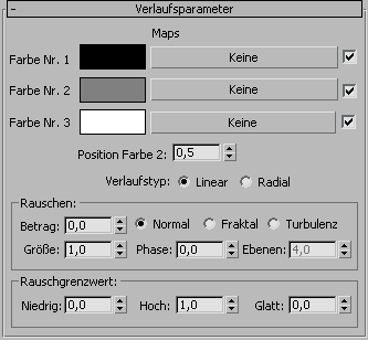 In beiden Fällen können Sie den Verlauf mithilfe der Winkelparameter auf dem Rollout Koordinaten drehen. UVW-Winkel können animiert werden.