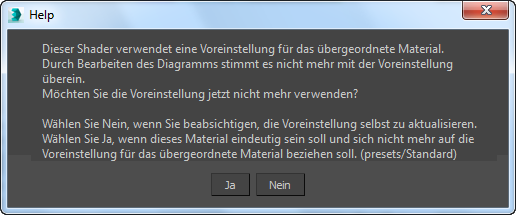 Diese Meldung wird immer dann angezeigt, wenn Sie versuchen, das Diagramm einer Voreinstellung zu ändern. Hierbei spielt es keine Rolle, ob es sich um eine benutzerdefinierte Voreinstellung oder um eine Standard-Voreinstellung, die im Lieferumfang von 3ds Max enthalten ist, handelt.