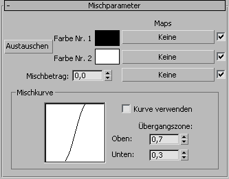 Mit diesen Parametern wird gesteuert, wie graduell bzw. wie scharf der Übergang zwischen den beiden gemischten Farben sein soll. (Dies ist eigentlich nur dann sinnvoll, wenn Sie ein Map auf "Mischbetrag" angewendet haben.)