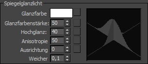 Die restlichen Steuerelemente im Bereich "Spiegelglanzlichter" hängen vom aktiven Shader ab (im Bereich "Schattierg.:" oben im Rollout). Diese Glanzlicht-Steuerelemente sind die gleichen, die für die Shader von Standardmaterialien verfügbar sind.