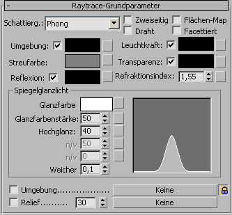 Durch das Rollout "Raytrace-Grundparameter" eines Raytrace-Materials werden die Schattierung, die Farbkomponenten, die Reflektivität oder Refraktivität und die Reliefs des Materials gesteuert.
