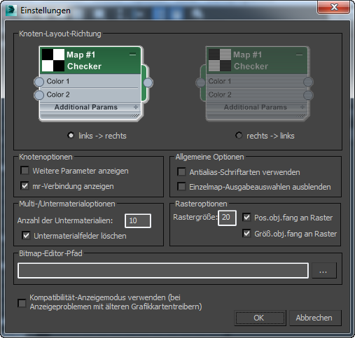 Mit dem Dialogfeld "Optionen" des erweiterten Material-Editors können Sie globale Einstellungen für das Verhalten des Editors festlegen.
