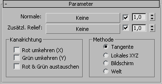 Vorgabemäßig gibt der rote Kanal des Normalen-Maps links (höhere Werte) im Vergleich zu rechts (kleinere Werte) an, während der grüne unten (höhere Werte) im Vergleich zu oben (kleinere Werte) und blau den vertikalen Abstand angibt. Mit den Steuerelementen in diesem Bereich können Sie diese Auslegung anpassen.