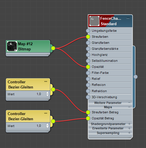 Wenn Sie die Komponenten eines Standardmaterials mappen, fügt der erweiterte Material-Editor automatisch entsprechende Controllerknoten hinzu. Wenn Sie beispielsweise ein Bitmap mit der Streufarbenkomponente des Materials vernetzen, ist auch ein Bezier-Float-Controller für den Streufarben-Betragsparameter vorhanden. Um diese Controller sehen zu können, müssen Sie die zusätzlichen Parameter anzeigen (Klicken Sie mit der rechten Maustaste auf den Materialknoten und wählen Sie dann Alle weiteren Parameter anzeigen).