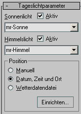 Im Rollout "Tageslichtparameter" können Sie das Sonnenobjekt des Tageslichtsystems definieren. Außerdem können Sie das Sonnen- und Himmelslichtverhalten festlegen.
