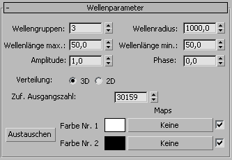Gibt den Radius der imaginären Kugel (3D-Ausbreitung) oder des Kreises (2D-Verteilung), deren Oberfläche bzw. dessen Fläche der Ursprung jeder Wellengruppe ist, in 3ds Max-Einheiten an. Ein großer Radius erzeugt große, kreisförmige Wellenmuster, während ein kleiner Radius dichte, kleinere Wellen erzeugt. Vorgabe = 800.