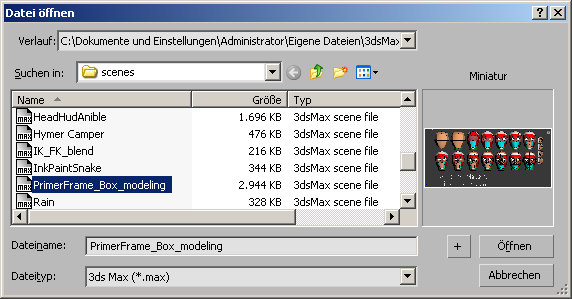 Das Dialogfeld "Datei öffnen" besitzt die Standardsteuerelemente von Windows zum Öffnen von Dateien. Im Bereich "Miniatur" auf der rechten Seite wird eine Vorschau der Szene angezeigt, deren Dateiname in der Liste auf der linken Seite markiert ist.