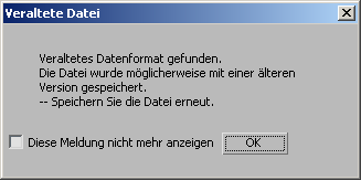 Wenn Sie diese Option aktivieren, wird das Dialogfeld "Veraltete Datei" nicht mehr angezeigt. Das Dialogfeld wird außerdem durch die Option "Meldung über veraltete Dateien anzeigen" im Menü "Anpassen"