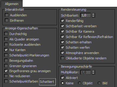 - Steuert die Sichtbarkeit von gerenderten Objekten. Bei einem Wert von 1,0 ist es vollständig sichtbar. Bei einem Wert von 0,0 ist das Objekt nach dem Rendern vollständig unsichtbar. Vorgabe = 1,0.