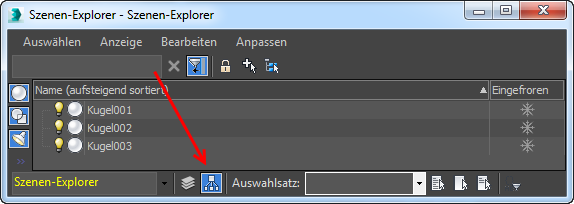 Die Benutzeroberfläche des Szenen-Explorers besteht aus einer Menüleiste, Werkzeugkästen und einer Tabellenansicht der Objekte in der Szene. Die Tabelle umfasst eine Zeile für jedes Objekt und eine Spalte für jede angezeigte Objekteigenschaft. Das Vorgabe-Layout in 3ds Max zeigt nur Objektnamen und die Eigenschaft Eingefroren an. Sie können das Layout so anpassen, dass zusätzliche Eigenschaften angezeigt werden. Sie können neben lokalen Szenen-Explorer-Konfigurationen, die mit der aktuellen Szene gespeichert und geladen werden, auch globale Szenen-Explorer-Konfigurationen erstellen, die in allen Szenen verfügbar sind.