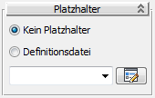 Wenn Sie "Definitionsdatei" wählen, ohne Platzhalter definiert zu haben, wird ein Dialogfeld zur Dateiauswahl geöffnet, über das Sie eine Platzhalterdatei wählen können. Anschließend wird der Name der Platzhalterdatei im Textfeld angezeigt, und die Datei ersetzt den ursprünglichen Container in der Szene.