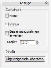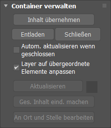Mit dem Rollout "Container verwalten" können Sie Container in Ihrer Szene öffnen, schließen, übernehmen, speichern und aktualisieren. Außerdem können Sie einen Quellcontainer in einen eindeutigen Container umwandeln.