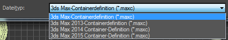 Im Dateidialogfeld können Sie die Dropdown-Liste Als Typ speichern verwenden, um Dateien im Format früherer 3ds Max-Versionen zu speichern, wie z. B. als 3ds Max 2013-Containerdefinition (*.maxc).