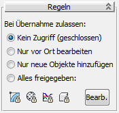 Anmerkung: Beim Aktualisieren eines übernommenen Containers mit der Regel "Alles Freigegebene" werden nur gesperrte Objekte und Attribute aktualisiert. Bei der Einstellung der Regeln sollten Sie sperren, was Sie selbst bearbeiten möchten. Wenn Sie etwas ändern, das freigegeben ist, wird diese Änderung nicht von anderen Benutzern übernommen. Wenn Sie Objekte oder Attribute lokal sperren, können Sie weiterhin auf sie zugreifen, indem Sie
