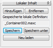 Regel "Nur neue Objekte hinzufügen" oder "Alles Freigegebene" eingestellt ist, wird der Container in geöffnetem Zustand der Szene hinzugefügt. Der normale Arbeitsablauf ist dann, den Container unter einem anderen, eindeutigen Namen zu speichern, und damit eine neue lokale Definition für den Container zu erstellen. Wenn ein solcher Container geöffnet ist, ist die lokale Definition gesperrt, sodass andere Benutzer sie nicht ändern können.