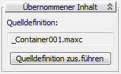 Das Rollout "Übernommener Inhalt" zeigt den Pfad und den Namen der aktuell ausgewählten Quellcontainer-Definition sowie die Datei an, aus der Sie den Inhalt übernehmen, und ermöglicht das Zusammenführen der Inhalte in einer Szene.