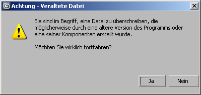 Wenn Sie eine Datei öffnen, die mit einer früheren Version von 3ds Max erstellt wurde, und dann versuchen, diese zu speichern, zeigt 3ds Max eine Warnung an, in der Sie darüber informiert werden, dass Sie dabei sind, die veraltete Datei zu überschreiben.