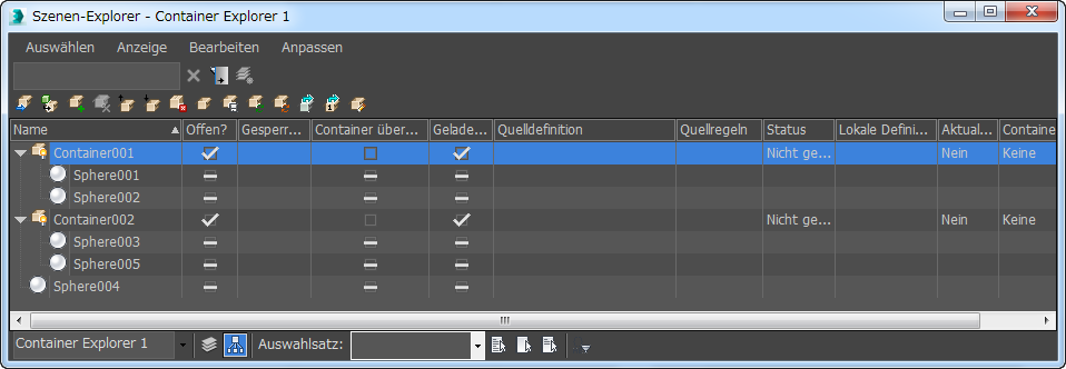 Der Container-Explorer ist ein modusunabhängiges Dialogfeld zur Anzeige, Sortierung und Auswahl von Containern und deren Inhalten. Er verfügt über alle Funktionen des Szenen-Explorers sowie zusätzliche containerspezifische Befehle im Werkzeugkasten "Container".