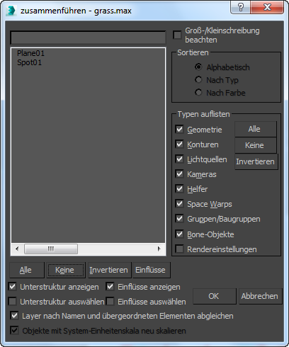 Im Dialogfeld "Zusammenführen" können Sie auswählen, ob beim Laden und Speichern von Einflüssen deren abhängige Objekte ebenfalls geladen und gespeichert werden sollen. In vielen Fällen sollten Objekte zusammen mit den zugehörigen Einflüssen referenziert werden. In der Anzeige wird allerdings lediglich auf die Beziehungen hingewiesen, diese müssen jedoch nicht notwendigerweise extern referenziert werden.