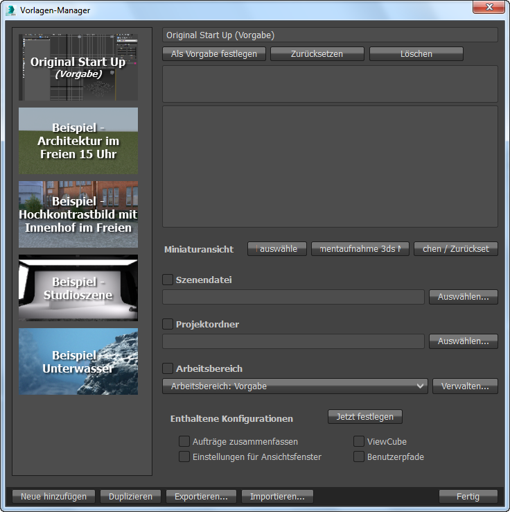 Die Standardvorlagen, die im Lieferumfang von 3ds Max enthalten sind, werden im Ordner