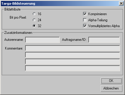 Wenn Sie im Dialogfeld "Render-Ausgabedatei" auf "Rendern" oder "Einrichten" klicken, wird das Dialogfeld "Targa-Bildsteuerung" geöffnet.