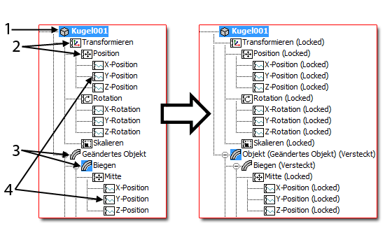 Durch das Sperren einer Komponente, in der Regel eine Spur "Geändertes Objekt" und ihre untergeordneten Modifikatoren oder eine Map oder Material, wird die Benutzeroberfläche ausgeblendet und alle zugehörigen Attribute werden gesperrt. Diesen Komponentenspuren wird nach dem Sperren die Bezeichnung "Ausgeblendet" zu ihrem Namen hinzugefügt. Sie können die Komponenteneinstellungen in der Benutzeroberfläche mit der Funktion "Freilegen" (siehe unten) anzeigen. Außerdem müssen Sie die Spuren für zu bearbeitende Parameter entsperren.