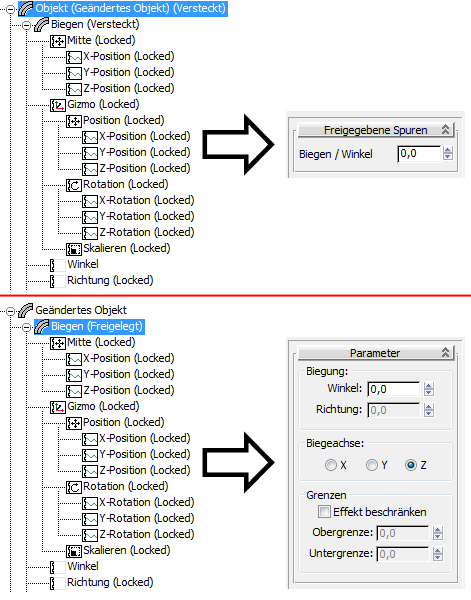 Beispiel: In der folgenden Abbildung zeigt der obere Teil den Abschnitt "Geändertes Objekt" der Hierarchie eines Objekts an, auf das der Modifikator "Biegen" angewendet wird. Die Knotenspur des Objekts war gesperrt und wurde anschließend freigegeben, und die Winkel-Spur des Modifikators wurde daraufhin freigegeben. Die resultierende Modifikatorgruppe wird rechts gezeigt.