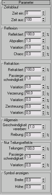 Die Optionen in diesem Bereich entsprechen denen im Bereich "Reflexion", wirken sich im Gegensatz zu diesen jedoch auf die Refraktion der Partikel aus, durch die die Partikel am Space Warp "POmniFlect" abgelenkt werden.