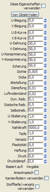 Die verbleibenden Steuerelemente für die Eigenschaften sind dieselben wie in der Gruppe "Stoffeigenschaften" im Dialogfeld "Objekteigenschaften" für Stoff.