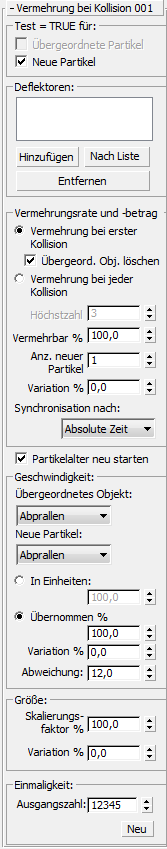 Höchstzahl Die maximale Anzahl von Kollisionen, bei denen übergeordnete Partikel neue Partikel erzeugen können. Diese Option ist nur verfügbar, wenn "Vermehrung bei jeder Kollision" aktiviert ist. Vorgabe = 3.