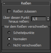 Mit diesen Steuerelementen können Sie das Reißen im mCloth-Objekt global steuern. Mit dem Rollout Gruppieren definieren Sie die Risse auf der Unterobjektebene Scheitelpunkt.