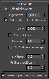- Die Dicke des mCloth-Objekts für Kollisionen mit steifen Körpern in der Simulation. Wenn die anderen Körper den Stoff schneiden, sollten Sie diesen Wert erhöhen.