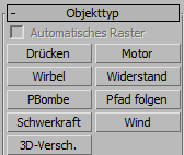 In der Befehlsgruppe gibt es für jeden Space Warp in den Kategorien Kräfte, Deflektoren und Geometrisch/Verformbar ein Rollout namens Unterstützt Objekte vom Typ. Dieses Rollout enthält die Objektarten, die an den Warp gebunden werden können.