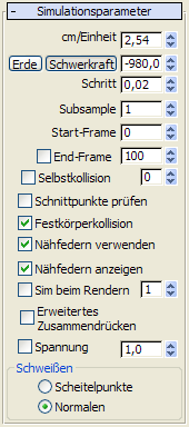 Mit den Einstellungen im Rollout "Simulationsparameter" können Sie die allgemeinen Eigenschaften der Simulation angeben, wie beispielsweise Schwerkraft, Start- und End-Frames sowie Nähfederungsoptionen. Diese Einstellungen werden global auf die Simulation angewendet, das heißt auf alle Objekte in der Simulation.