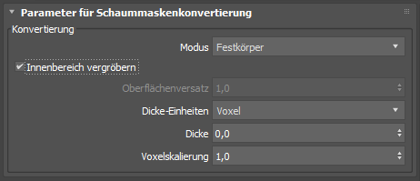 Alle Schaummasken in einer Simulation werden in Voxel konvertiert und anschließend verwendet, um zu bestimmen, ob sich ein Bereich innerhalb des entsprechenden Volumens befindet oder nicht. Die Konvertierungsoptionen steuern, wie die zugehörigen Masken voxeliert werden. Bei Schaummasken ist die Basisbreite jedes Voxels das Produkt der Master-Voxelgröße in den Simulationsparametern und der Voxelskalierung in dieser Gruppe.