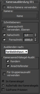 - Ermöglicht die Angabe einer Kamera, die zum Ausblenden von Partikeln verwendet werden soll. Klicken Sie auf die Schaltfläche Keine und wählen Sie in der Szene eine Kamera für die Kameraausblendung aus. Der Name der Kamera wird auf der Schaltfläche angezeigt. Nur verfügbar, wenn die Option Aktive Kamera verwenden deaktiviert ist.