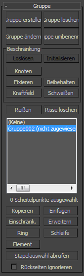 Mit dem Rollout "Gruppe" können Sie Scheitelpunktgruppen auswählen und sie auf Oberflächen sowie Kollisionsobjekte beschränken.