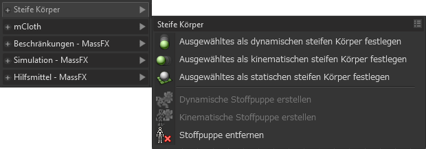 Das über das Menü "Animation" verfügbare Untermenü "Simulation - MassFX" bietet eine alternative Route zu vielen Funktionen.