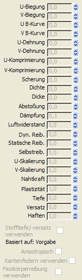Diese Steuerelemente für die Eigenschaften sind dieselben wie in der Gruppe "Stoffeigenschaften" im Dialogfeld "Objekteigenschaften" für Stoff.