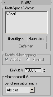 Ein Beispiel: Sie wenden die Space Warps "Wind" und "Schwerkraft" auf die Partikel an und setzen die Stärke auf "1,5" bzw. "1,0". Wenn Sie "Additiv" wählen, hat der Space Warp "Wind" ca. 50 Prozent mehr Einfluss auf die Partikel als der Space Warp "Schwerkraft". Wenn Sie hingegen "Maximal" wählen, wird nur der Space Warp "Wind" auf die Partikel angewendet.