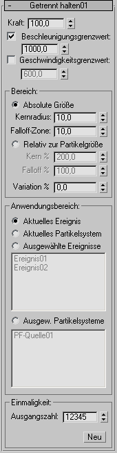 Die Kraft des Operators "Getrennt halten" trennt Partikel als Vorgabe nur im aktuellen Ereignis voneinander (d. h. in dem Ereignis, das den Operator "Getrennt halten" enthält), wenn der Operator lokal angewendet wird, bzw. nur die Partikel in den Ereignissen im aktuellen Fluss, wenn der Operator global angewendet wird. Im Bereich "Anwendungsbereich" können Sie festlegen, dass Partikel von Partikeln in anderen Ereignissen oder Flüssen getrennt werden, ohne dass das Verhalten der Flüsse selbst beeinflusst wird. Vorgabe = Aktuelles Ereignis.