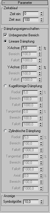 In diesem Bereich können Sie zwischen den Optionen "Lineare Dämpfung", "Kugelförmige Dämpfung" oder "Zylindrische Dämpfung" wählen und eine Reihe von Parametern festlegen.
