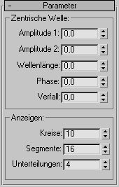 - Wenn Sie für "Verfall" den Wert 0,0 einstellen, besitzt die zentrische Welle im gesamten Raum die gleichen Amplituden. Wenn Sie den Wert für "Verfall" erhöhen, verkleinert sich die Amplitude, je mehr sich der Abstand von der Position des Warp-Objekts "Zentrische Welle" vergrößert. Vorgabe = 0,0.