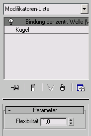 Der Space Warp "Zentrische Welle" verfügt außerdem über den Parameter "Flexibilität", den Sie individuell im Stapel jedes gebundenen Objekts auf der Ebene "Bindung der zentrischen Welle" einstellen können. Der Parameter gehört zur jeweiligen Bindung. Er wird daher nicht in den Warp-Parametern für die zentrische Welle angezeigt.