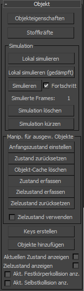 Nach dem Anwenden des Modifikators "Stoff" wird zunächste das Rollout "Objekt" auf der Befehlsgruppe angezeigt. Dieses Rollout enthält hauptsächlich Optionen zum Erstellen einer Stoff-Simulation und Anpassen der Gewebeeigenschaften.