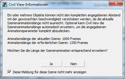 3ds Max zeigt eine Warnmeldung an, in der Sie gefragt werden, ob Sie die Animationslänge der Szene auf den Wert anpassen wollen, der durch das Animieren der Autos vorgegeben ist.